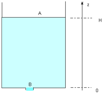On utilise en travaux pratiques une cuve verticale (voir schéma ci-contre) remplie d'eau ; on supposera que le niveau A dans la cuve est constant. Le fluide s'écoule par un trou de diamètre D situé dans le fond de la cuve. L'eau sera considérée comme un fluide parfait incompressible.