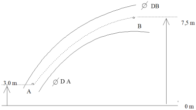 On défini \(\large z_\mathrm{A}=0\) et \(\large z_\mathrm{E}=5\ \mathrm{m}\) (et aussi \(z_\mathrm{B}=35\ \mathrm{m}\) ).
