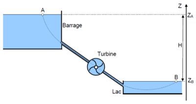 \(\large W_\mathrm{AB}<0\) dans le cas d'une turbine : L'énergie en B (après) est plus petite (à cause de la turbine qui transforme une partie de l'énergie mécanique du fluide en énergie électrique) à l'énergie en A (avant).