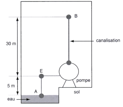 La pression en E est d'environ \(\large 50\ 000\ \mathrm{Pa}\) à \(\large 5\ \mathrm{m}\) de hauteur, il ne faudrait pas que la pompe soit beaucoup plus haute, sinon la pression pourrait devenir inférieure à la valeur de \(\large 1\ 700\ \mathrm{Pa}\), ce qui occasionnerait de la cavitation.